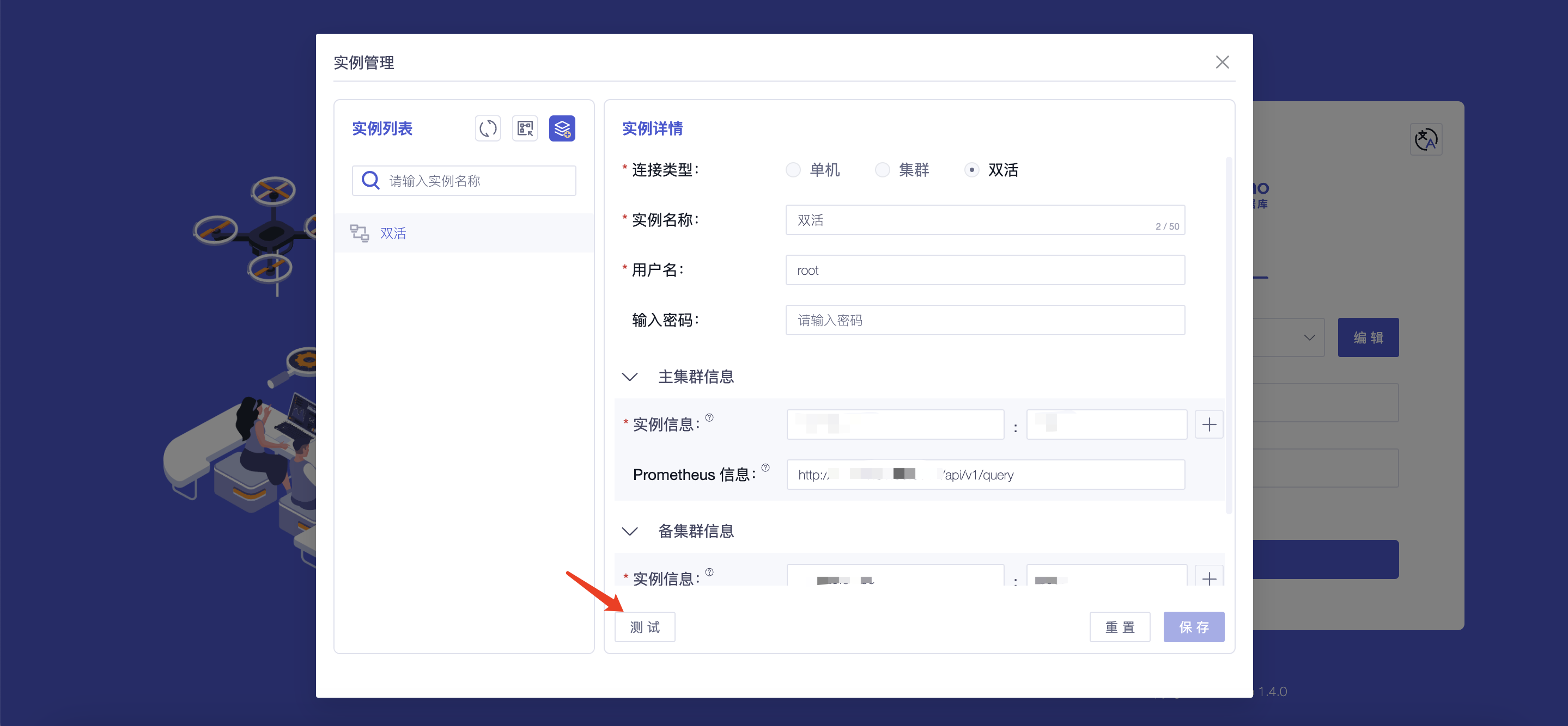 连接类型 | 是 | 不同连接类型连接所填内容不同,支持选择“单机、集群、双活” | - |